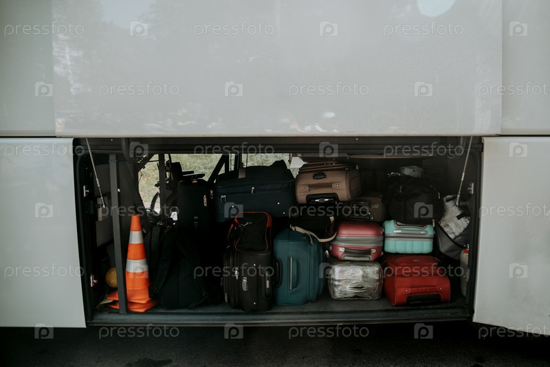 Чемоданы туристов загружены в багажник автобуса, транспортный шаттл тур отпуск