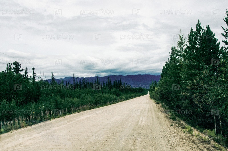Дорога в пригороде, старое потрескавшееся асфальтовое шоссе, туманный пейзаж гор и лесов