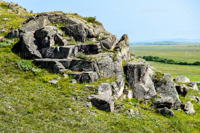 Горный пейзаж, лето, синее небо, трава, горы, скалы