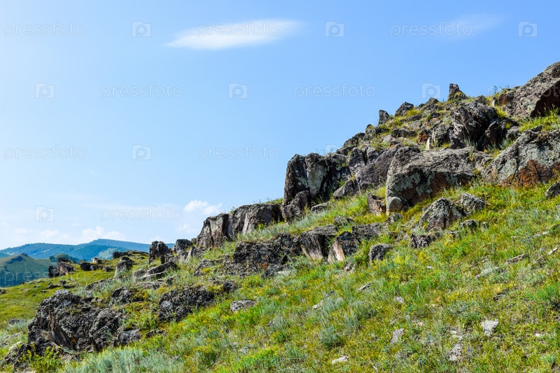 Горный пейзаж, лето, синее небо, трава, горы, скалы