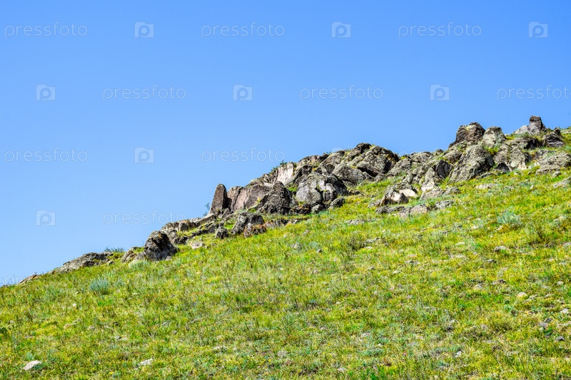 Горный пейзаж, лето, синее небо, трава, горы, скалы