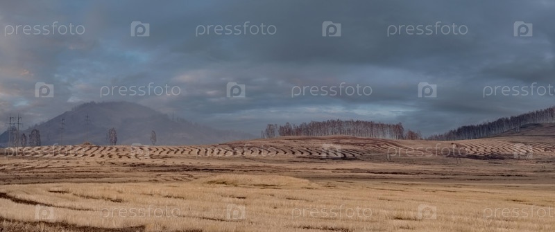 Россия. Красноярский край. Утренний вид на рельефные холмы со скошенными полями в дымке под небом с живописными облаками