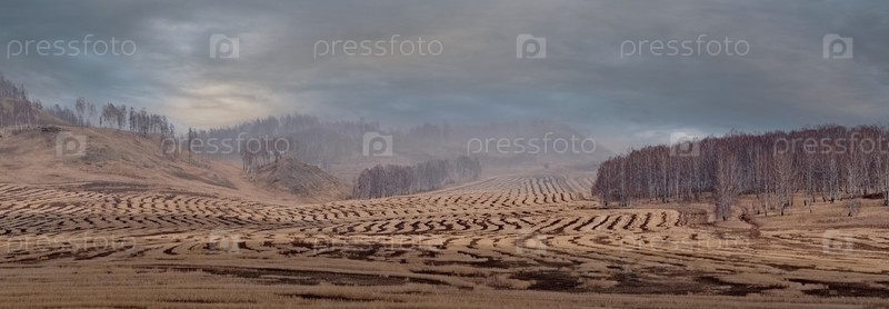 Россия. Красноярский край. Утренний вид на рельефные холмы со скошенными полями в дымке под небом с живописными облаками