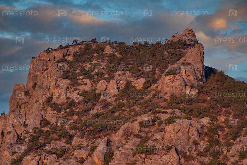 Россия, Новый Свет. Живописный вид на подсвеченные рассветным солнцем скалы на побережье Черного моря с мыса Капчик на Крымском полуострове