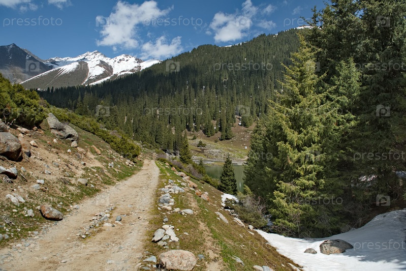 Кыргызстан. Вид на горное озеро Суттуу-Булак в горах на северном побережье озера Иссык-Куль
