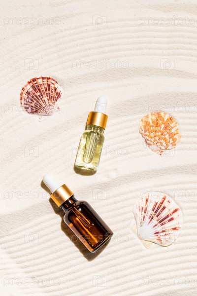 Два косметических флакона с капельницей с увлажняющим средством для ухода за кожей лица на бежевых морских песочных мешочках. Средство для сухой кожи. Верхний вертикальный вид