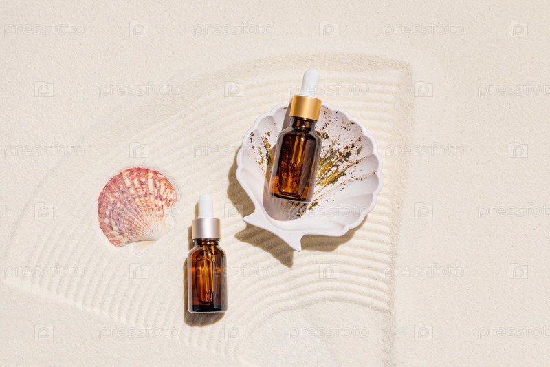 Два косметических флакона с капельницей с увлажняющим и питательным средством для ухода за сухой кожей на белом морском песке и ракушках. вид сверху