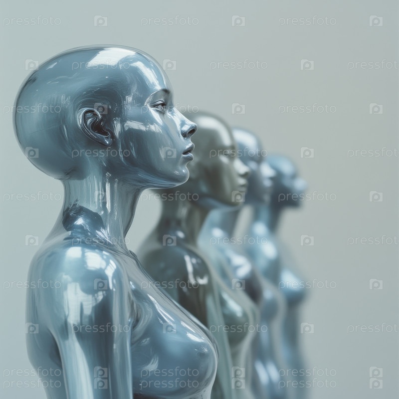 Изображение ряда роботов-андроидов на белом фоне. Генерация ИИ