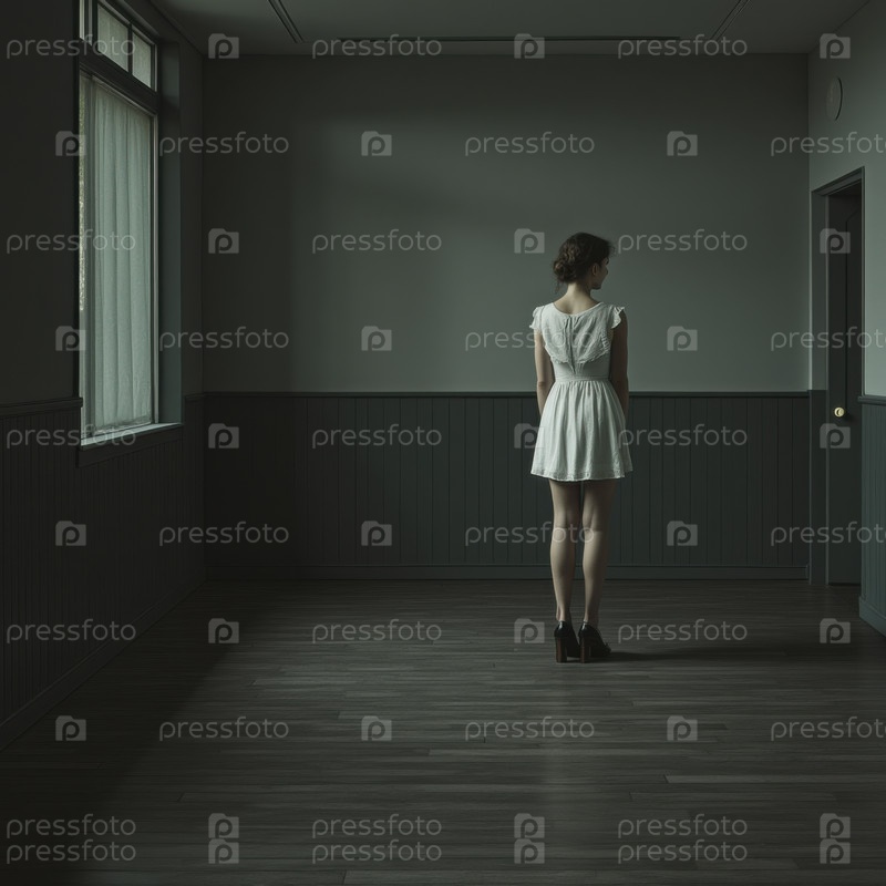 Женщина в винтажном платье стоит в пустой комнате.Поколение ИИ
