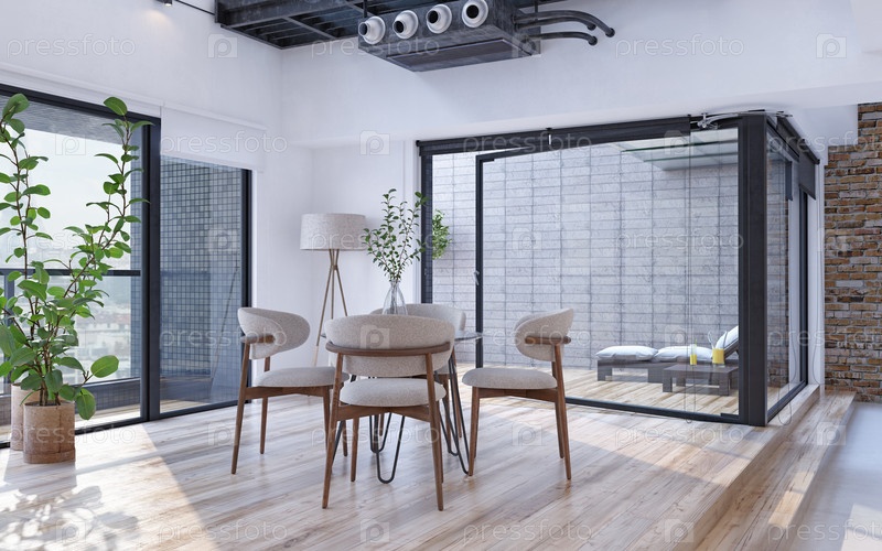 Современная обеденная зона с минималистическими деревянными акцентами, удобными стульями, круглым столом и ярким освещением. 3D-рендеринг