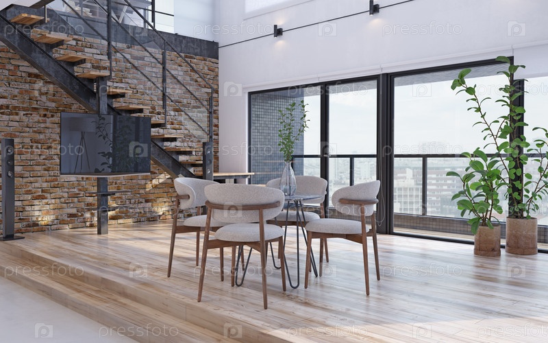 Современная обеденная зона с минималистическими деревянными акцентами, удобными стульями, круглым столом и ярким освещением. 3D-рендеринг