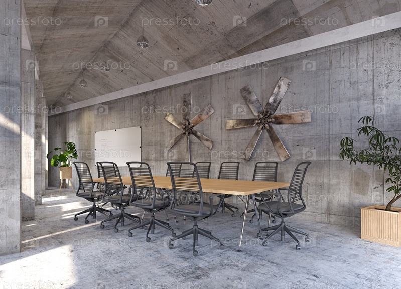 Элегантный офис-конференцзал с минималистическим дизайном, с длинным столом и большими бетонными окнами, заполняющими пространство светом