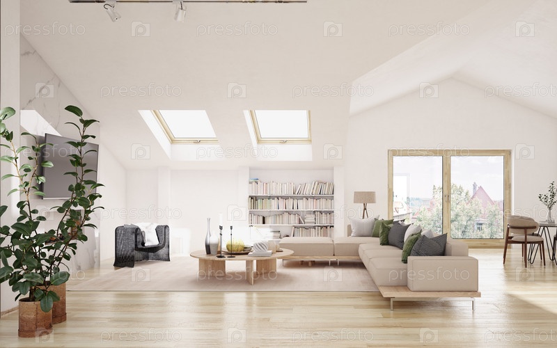 Светлая, минималистичная гостиная в стиле лофт с современной мебелью и естественным освещением. 3D-рендеринг