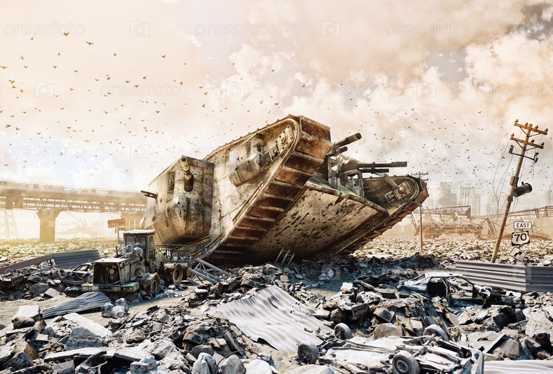 Футуристическая военная сцена с танком-монстром