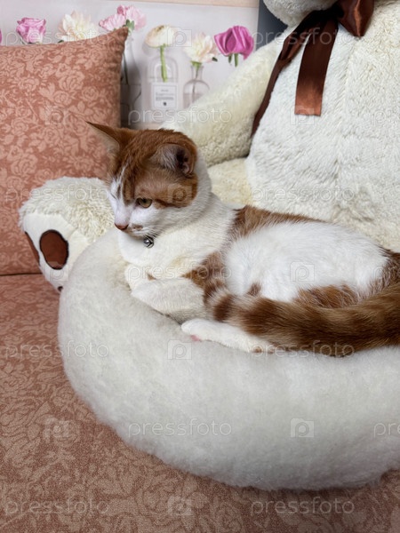 Рыжий кот сидит на лежанке. Кровать белая