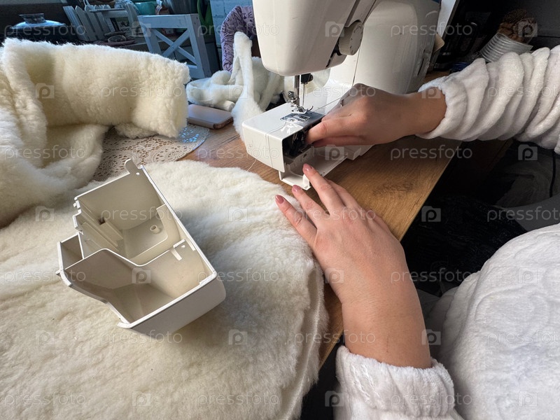 Женщина заправляет нитку в швейную машинку. Она шьет лежанку для домашнего животного из меха