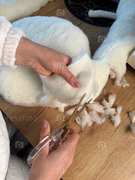 Женщина делает мягкий наполнитель из обрезков ткани. Разрезает обрезки ткани на части, делает набивку. Она шьет лежанку для питомца. Крупный план. Фото сверху