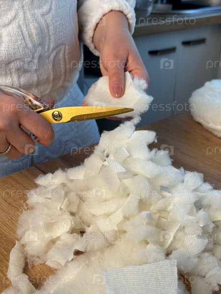 Женщина делает мягкий наполнитель из обрезков ткани. Разрезает обрезки ткани на части, делает набивку. Она шьет лежанку для питомца