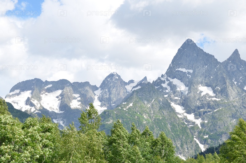 Вид на Главный Кавказский Хребет с территории Тебердинского национального парка у озера Туманлы-Кель в Гоначхирском ущелье, Карачаево-Черкесская Республика