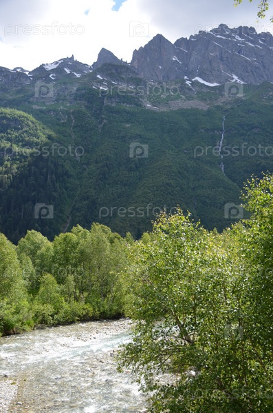 Бурная горная река Кичи-Муруджу в Тебердинском национальном парке у государственной границы России и Абхазии, Карачаево-Черкесская Республика