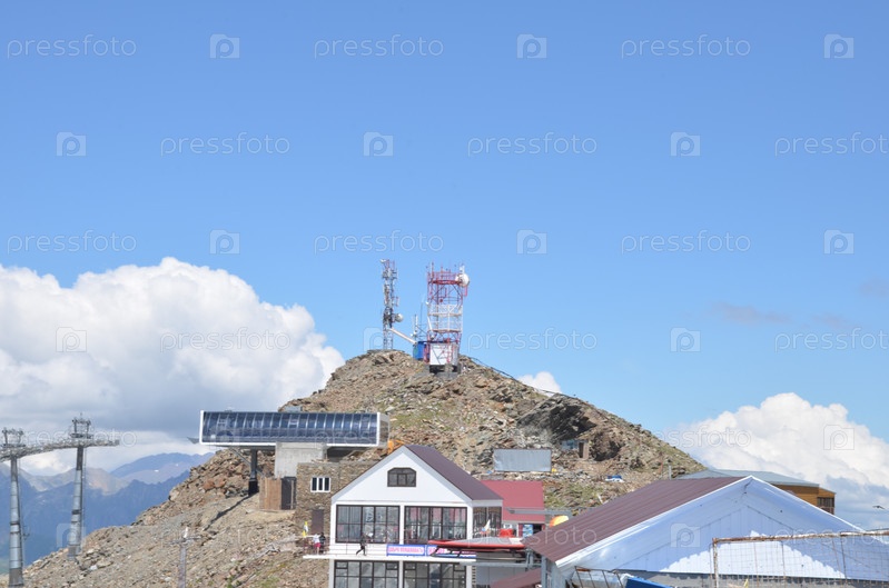 Станция канатной дороги и инфраструктура вокруг нее (кафе, вышки связи) на горе Мусса-Ачитара, Домбай, Карачаево-Черкесская Республика