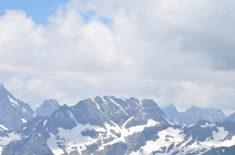 Вид на Главный Кавказский Хребет со смотровой площадки горы Мусса-Ачитара, заснеженные вершины, Домбай, Карачаево-Черкесская Республика