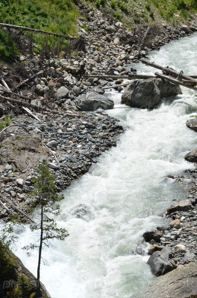 Вид на реку Аманауз в курортном поселке Домбай в летний день, Карачаево-Черкесская Республика