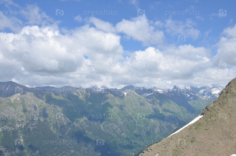 Вид на Главный Кавказский Хребет со смотровой площадки горы Мусса-Ачитара, заснеженные вершины, Домбай, Карачаево-Черкесская Республика