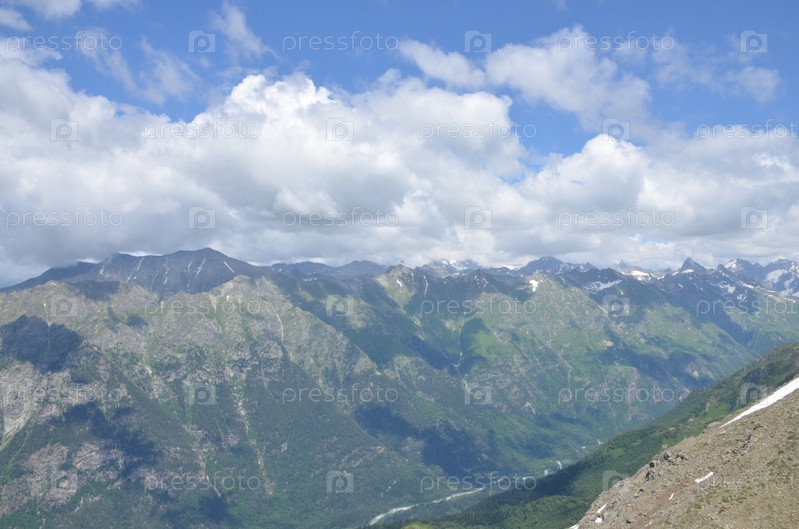 Вид на Главный Кавказский Хребет со смотровой площадки горы Мусса-Ачитара, заснеженные вершины, Домбай, Карачаево-Черкесская Республика