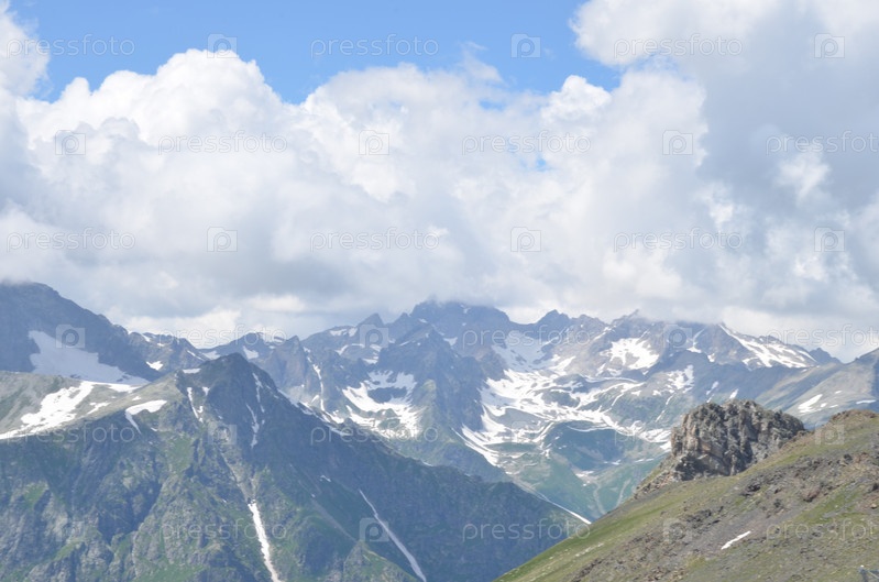 Вид на Главный Кавказский Хребет со смотровой площадки горы Мусса-Ачитара, заснеженные вершины, Домбай, Карачаево-Черкесская Республика