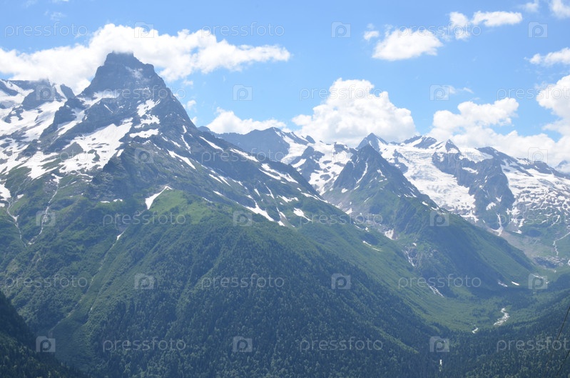 Вид на Главный Кавказский Хребет со смотровой площадки горы Мусса-Ачитара, заснеженные вершины, Домбай, Россия, Карачаево-Черкесская Республика