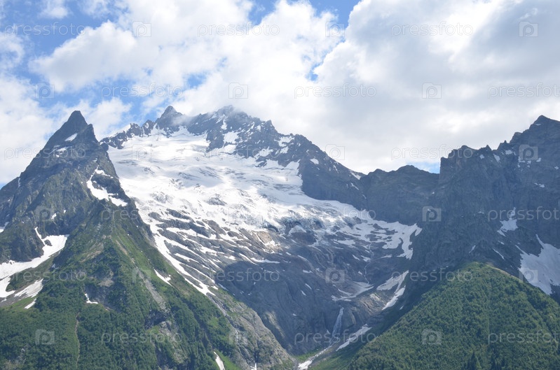 Вид на Главный Кавказский Хребет со смотровой площадки горы Мусса-Ачитара, заснеженные вершины, Домбай, Россия, Карачаево-Черкесская Республика