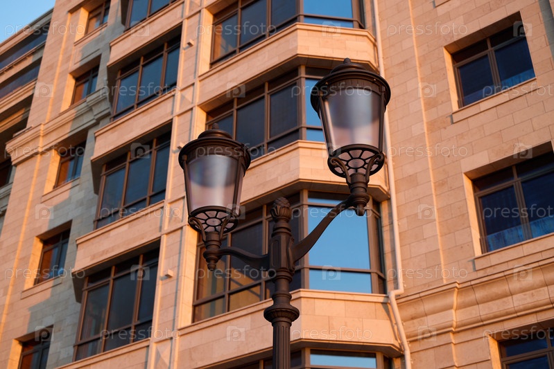 Очаровательные и элегантные уличные фонари выделяются на фоне современных архитектурных сооружений