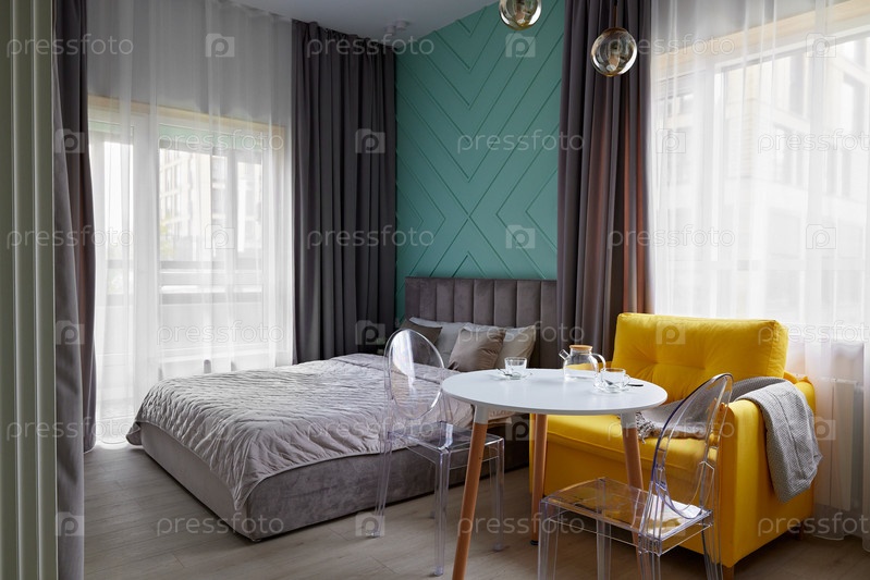 Уютная и современная спальня с ярким желтым акцентным креслом и большими окнами