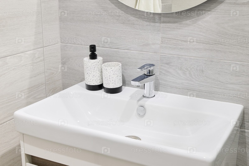 Современная раковина для ванной комнаты со стильными минималистскими аксессуарами и декором