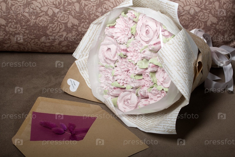 Букет зефира. Зефирные цветы. Упаковано в крафтовую бумагу. Рядом поздравительная открытка в конверте. Крупный план
