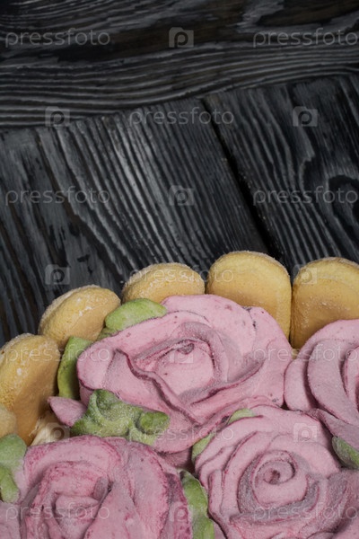 Торт с печеньем Савоярди и розами из маршмеллоу. Крупный план