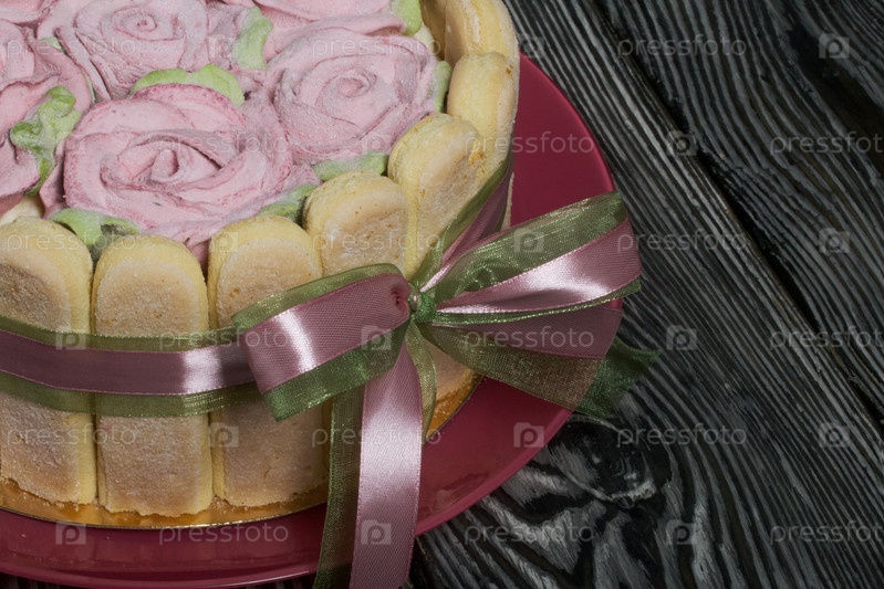 Торт с печеньем Савоярди и розами из маршмеллоу. Перевязан лентой. Лента завязана бантом