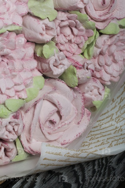 Букет из зефира. Зефирные цветы. Упаковано в крафтовую бумагу. Крупный план