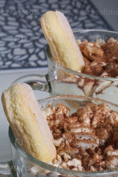 Десерт с печеньем Савоярди и кремом. Печенье Тирамису. Крупный план