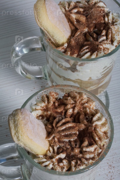 Десерт с печеньем Савоярди и кремом. Печенье Тирамису. Крупный план