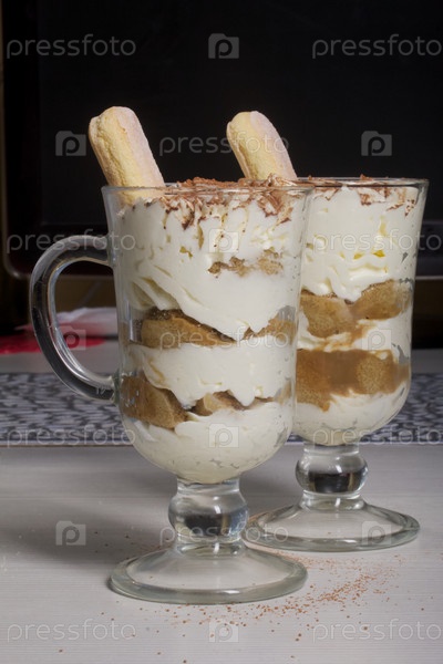 Десерт с печеньем Савоярди и кремом. Печенье Тирамису. Крупный план