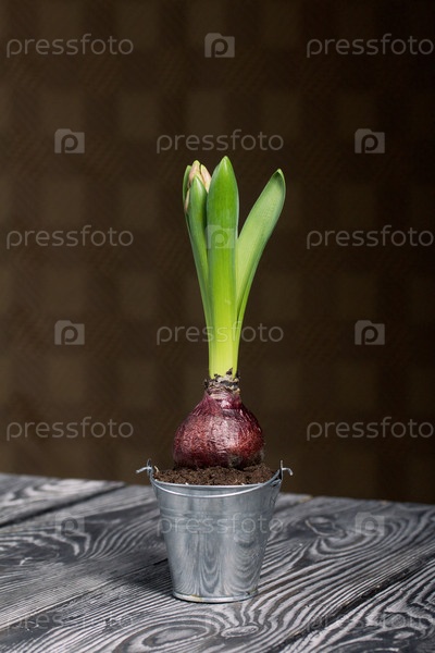 Гиацинт в декоративном ведре. Крупный план