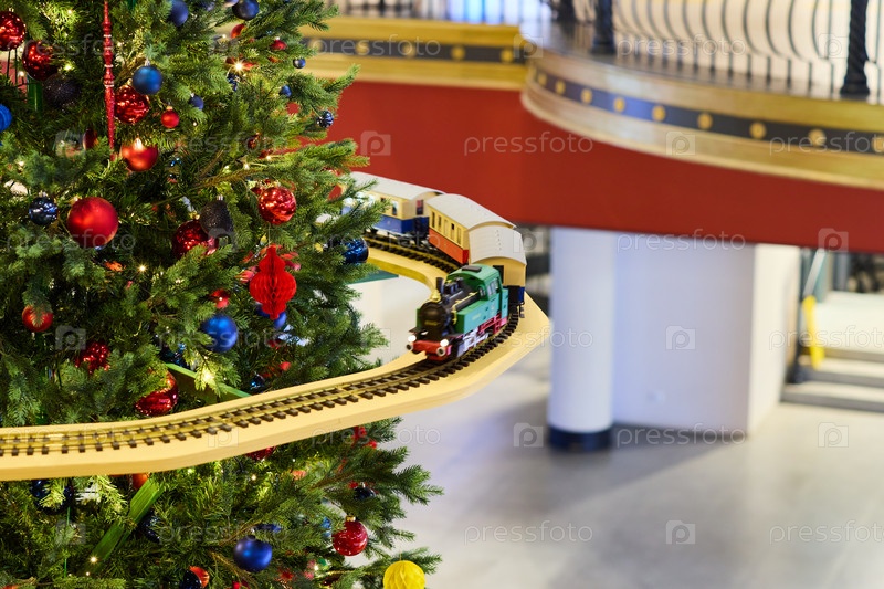Праздничная рождественская елка, красиво украшенная восхитительными украшениями в виде поезда для этого сезона