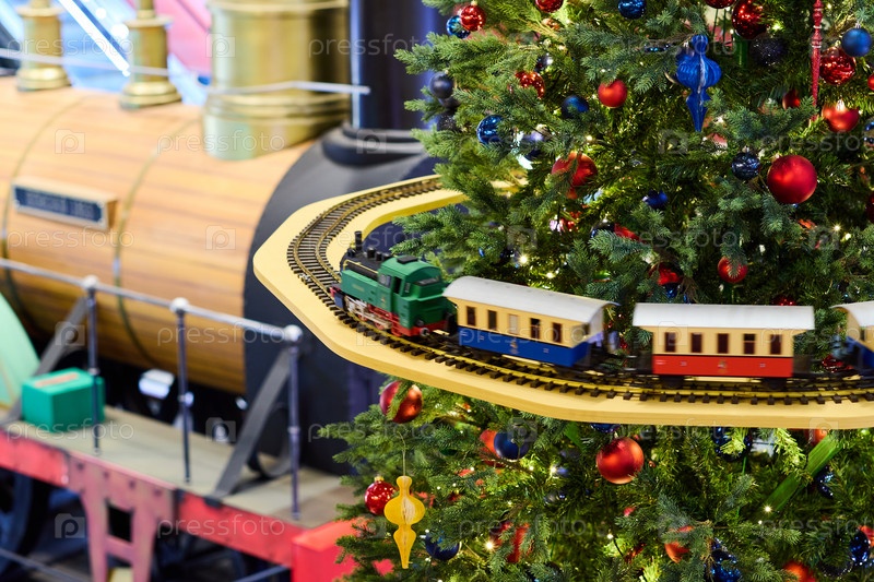Красиво оформленный и красочный праздничный поезд на очаровательной рождественской елке