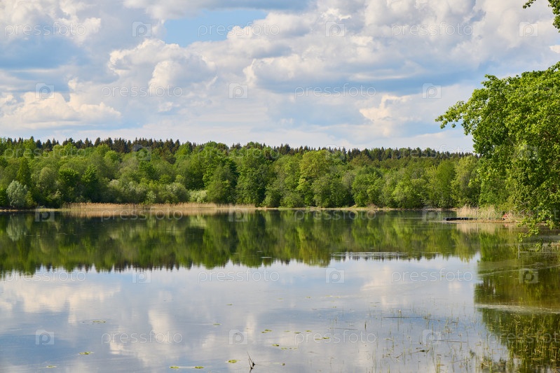 Спокойный и живописный вид на берег озера, окруженный пышной зеленью под облачным небом