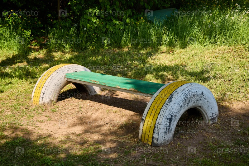 Оцените красоту скамейки из переработанных шин, установленной в спокойной обстановке природы