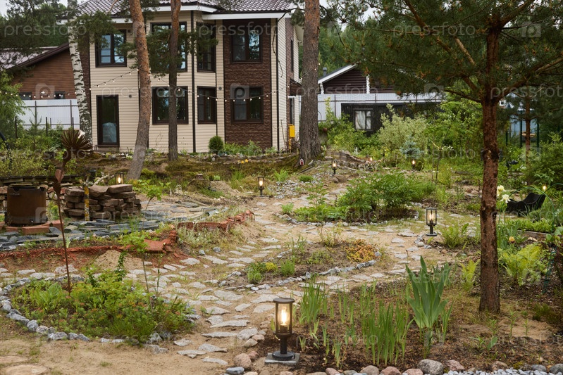 Тихая садовая дорожка, окруженная очаровательным домом, окруженным пышной зеленью