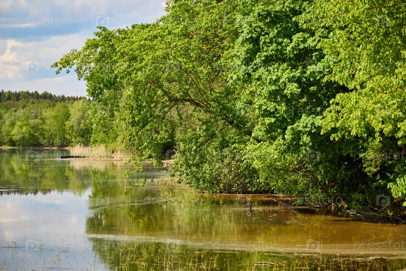 Спокойное озеро, окруженное пышной зеленью деревьев и великолепием природы