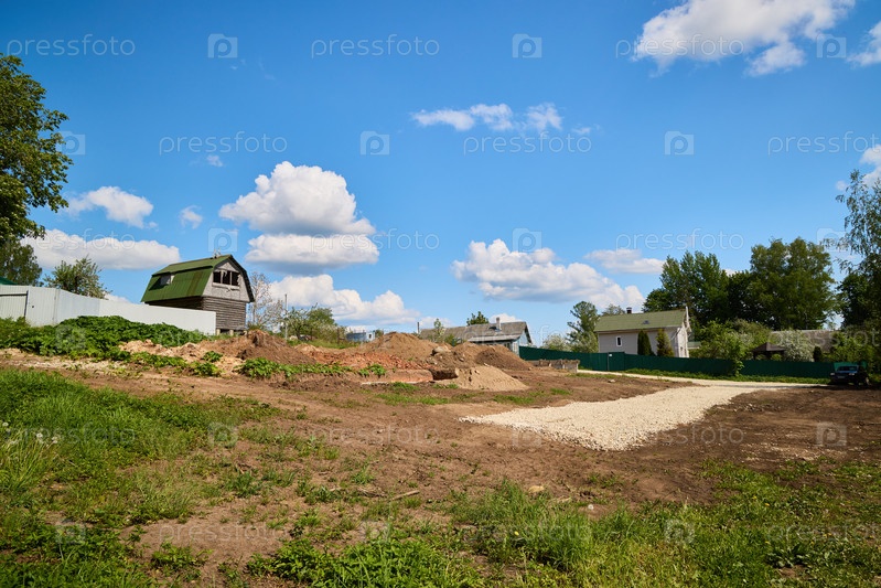 Живописный сельский пейзаж с ясным голубым небом и строительной площадкой